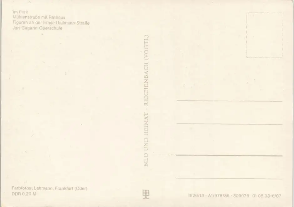 Name: Im Park, Mühlenstraße mit Rathaus, Figuren an der Ernst-Thälmann-Straße, Juri-Gagarin-Oberschule