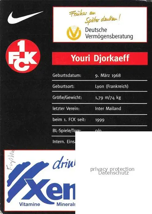 Fussball Soccer Football-- Youri Djorkaeff FC Kaiserslautern postalisch nicht gelaufen Erhaltung siehe scans [IrynaD87]
