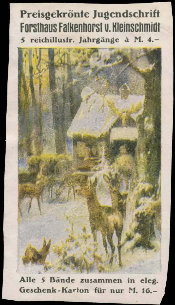 Forsthaus Falkenhorst v. Kleinschmidt, Preisgekrönte Jugendschrift, Jagd, Hase, Größe/Zustand: 8x4 , beschnitten, Rückseite fleckig sonst guter Zustand, Original alte Reklamemarke die seinerzeit für die Werbung benutzt wurde