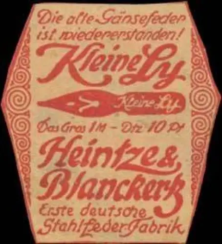 Die alte Gänsefeder ist wiedererstanden! Die Kleine Ly. Erste deutsche Stahlfeder-Fabrik, Schreibwaren, Größe/Zustand: 4x3 , guter Zustand, Original alte Reklamemarke die seinerzeit für die Werbung benutzt wurde