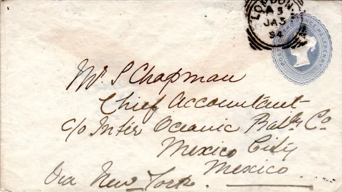 Mexico arrival mark on backside. Interesting adress: ...Inter Oceanic Railway Co...."