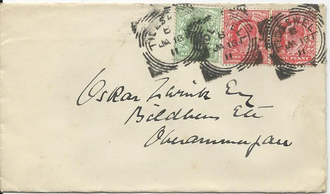 GB 1911, squared circle TIDESWELL auf Brief m. 3 Marken n. Bayern