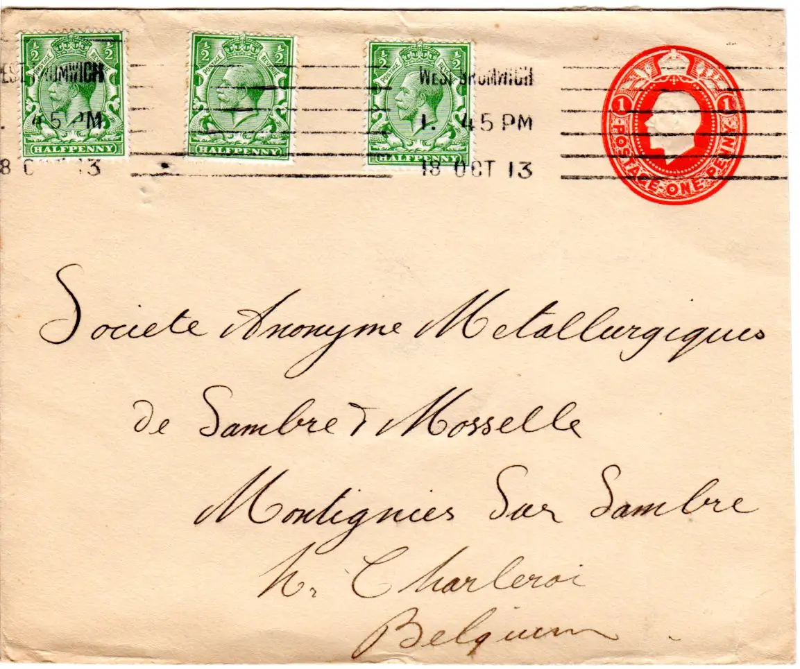 GB 1913, 3x1/2d on 1d stationery envelope from West Bromwich to Belgium