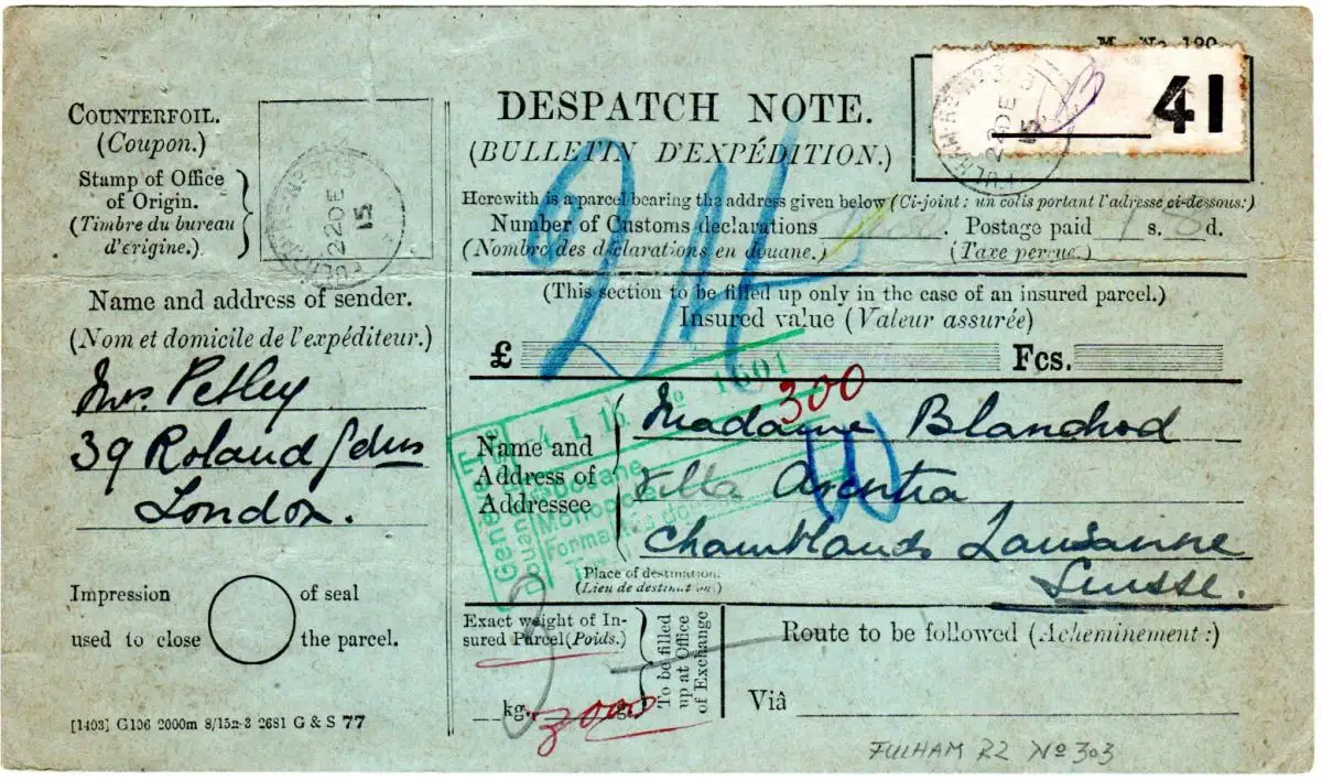GB 1915, Formular Parcel Dispatch Note v. FULHAM i.d. Schweiz. Porto