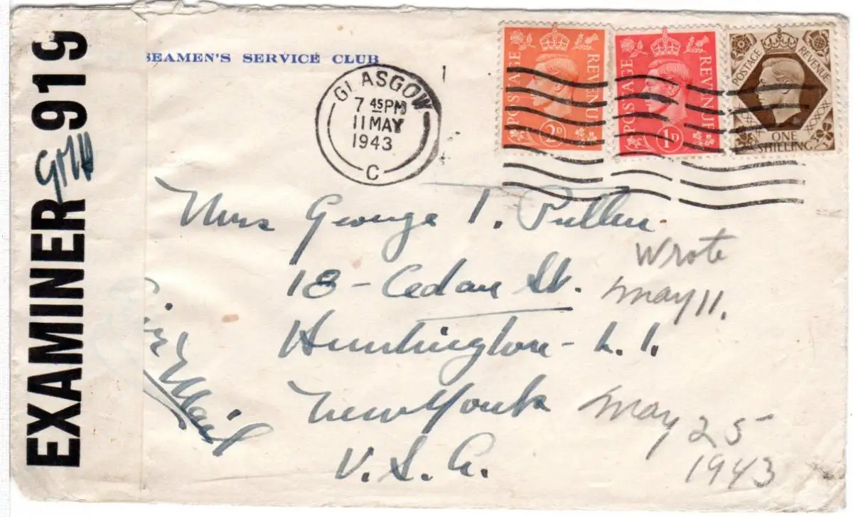 GB 1943, 1+2d+1 Sh.auf Luftpost Zensur Brief v. Glasgow n. USA