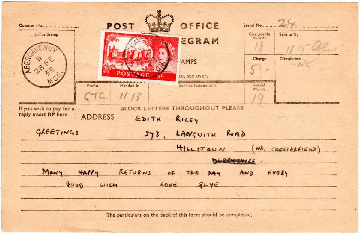 GB 1958, EF 5 Sh. auf Telegramm Formular v. ABERGAVENNY.