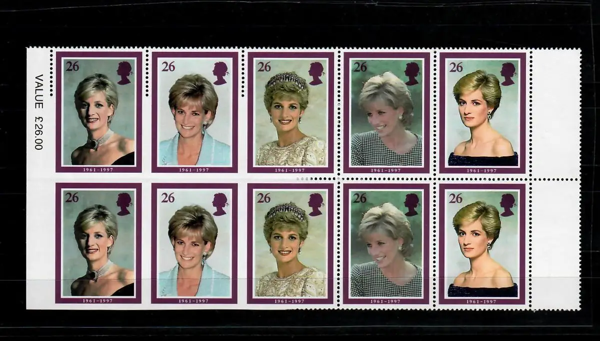 GB: DIANA 1997, block of ten, part imperf with margins on two sides, scarce, **