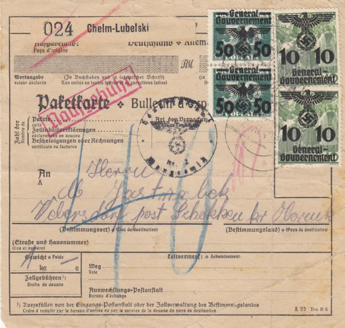 GG: Auslandspaketkarte Chelm, deutsches Formular, MiF #38, Bug/Riss unten