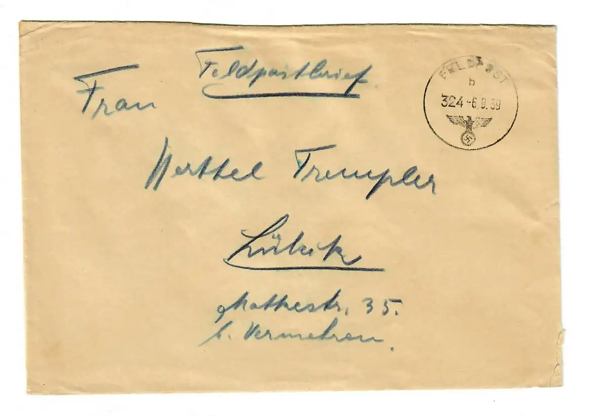 GG Feldpost 6.9.39, sehr frühe Feldpost FPNr. 26761 nach Lübeck