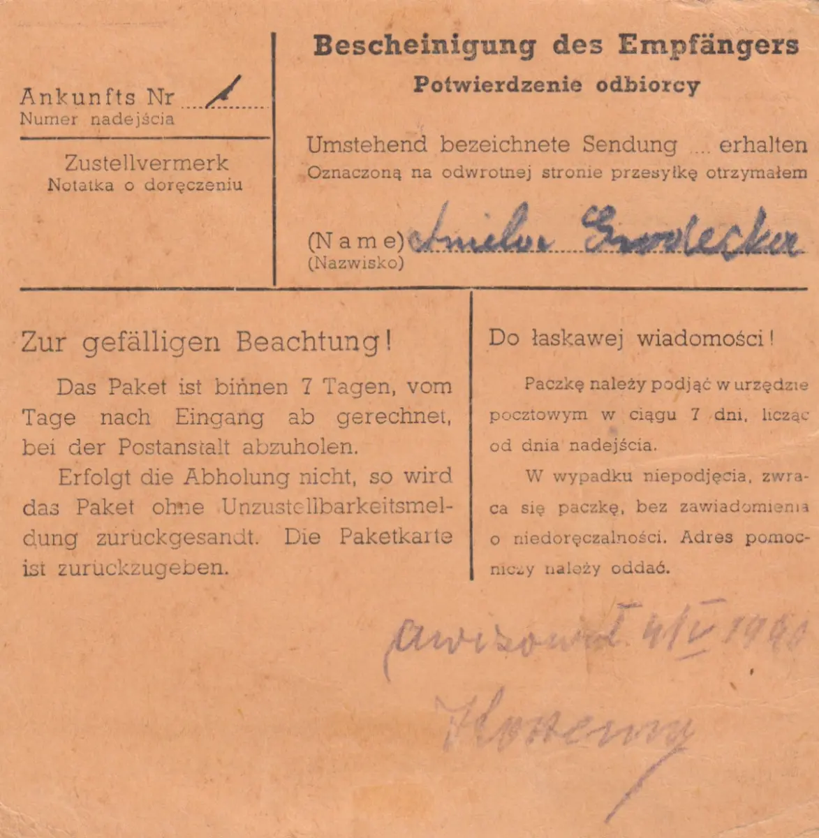 GG Inlandspaketkarte Tryncza - Glogow, MeF 30 Gr.