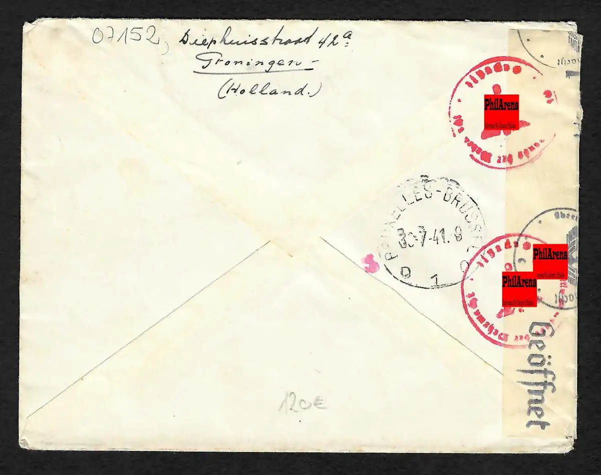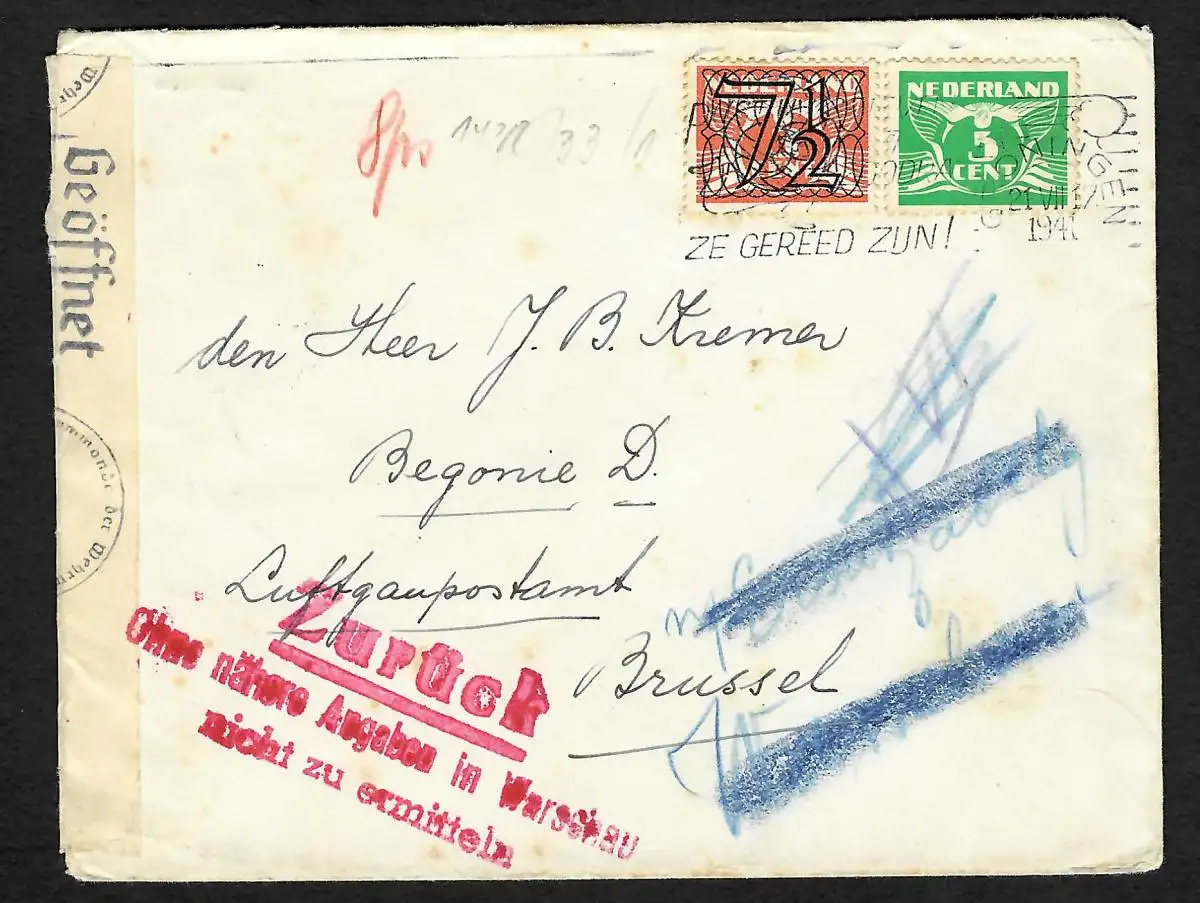 Für mehr Informationen siehe Scan: Brief aus Niederlande nach Brüssel 1941 über die OKW Zensurstelle an das Luftgaupostamt Brüssel. Irgendwie kam der Brief nach Warschau und erhielt diesen sehr seltenen Stempel: Zurück: Ohne nähtere Angaben in Warschau nicht zu ermitteln. Sehr sehr selten.