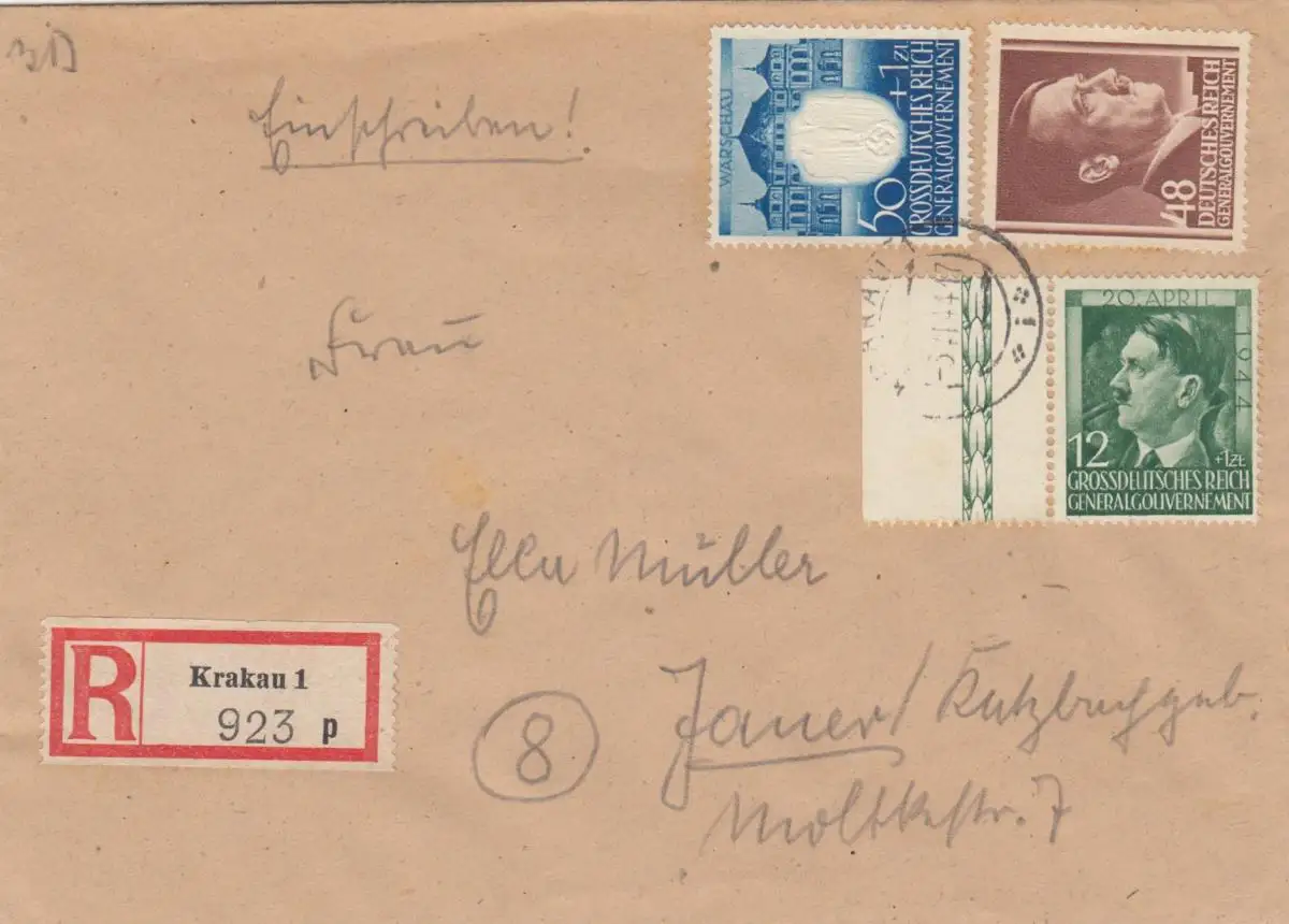GG: MiF Einschreiben Krakau nach Jauer, 2 Gr. überfrankiert