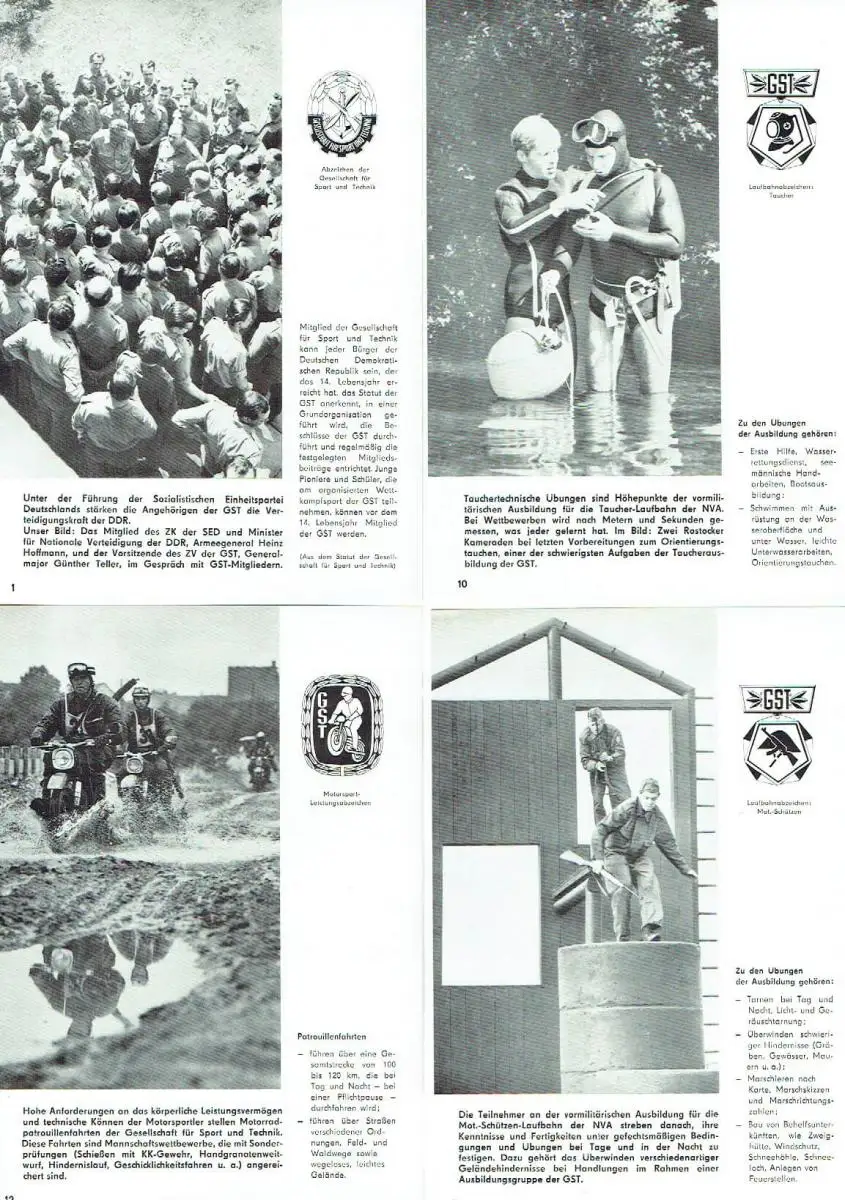 sehr guter Zustand, geringe Gebrauchs- und Alterungsspuren: Mappe geringfügig abgenutzt und schwach schmutzfingrig - Tafeln sauber und ordentlich, Bildmappe mit 17 Bildern aus dem Alltag der Gesellschaft für Sport und Technik Themen, Wissen und Übungen zu den Abzeichen: - Dinststellungsabzeichen - Mehrkampfabzeichen - Segelschulschiff - Massenschießabzeichen - Motorsport-Leistungsabzeichen - Segelflieger-Leistungsabzeichen - Laufbahnabzeichen: Taucher - Laufbahnabzeichen: Maritime Laufbahnen (Marine) - Lausbahn-Abzeichen: Flugzugführer-Ingenieur - Laufbahnabzeichen: Tastfunker/Fernschreiber - u. a, Softcover, ca. 15 x 21, 16 Bildtafeln in original Umschlag (komplett)