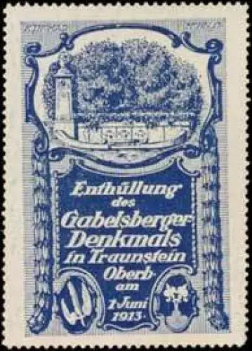 Enthüllung des Gabelsberger Denkmals in Traunstein, Oberbayern, Größe/Zustand: 7x5 , guter Zustand, Original alte Reklamemarke die seinerzeit für die Werbung benutzt wurde