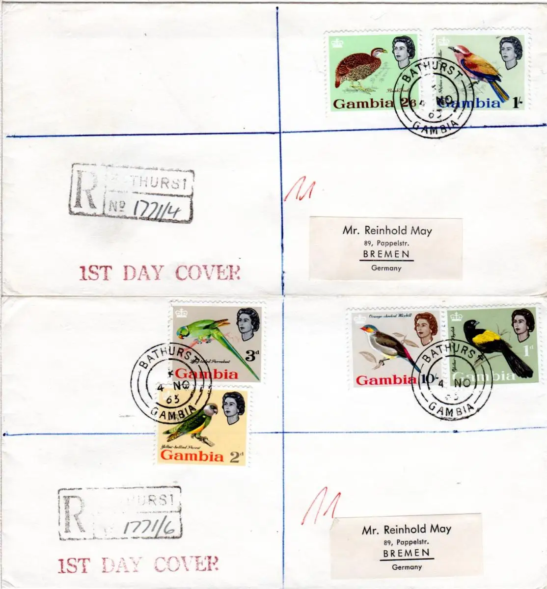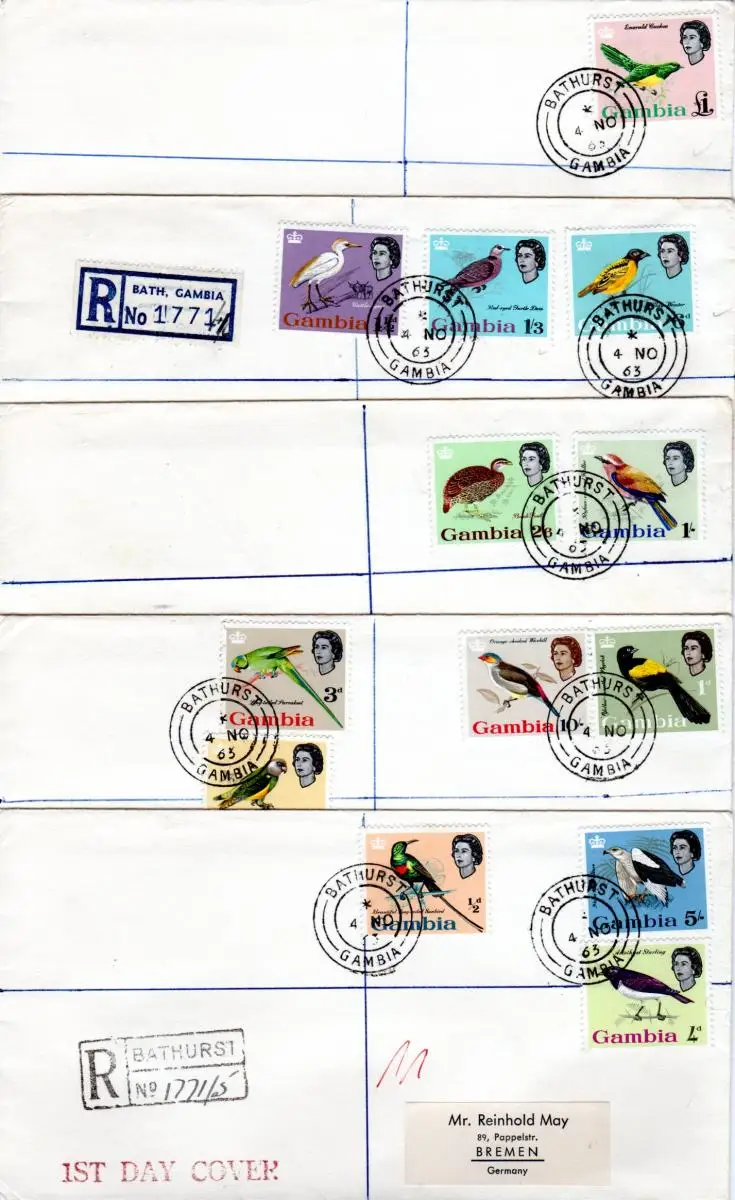 Gambia 1963, kpl. Vögel-Ausgabe m. 13 Werten auf 5 echt gelaufenen FDC Briefen