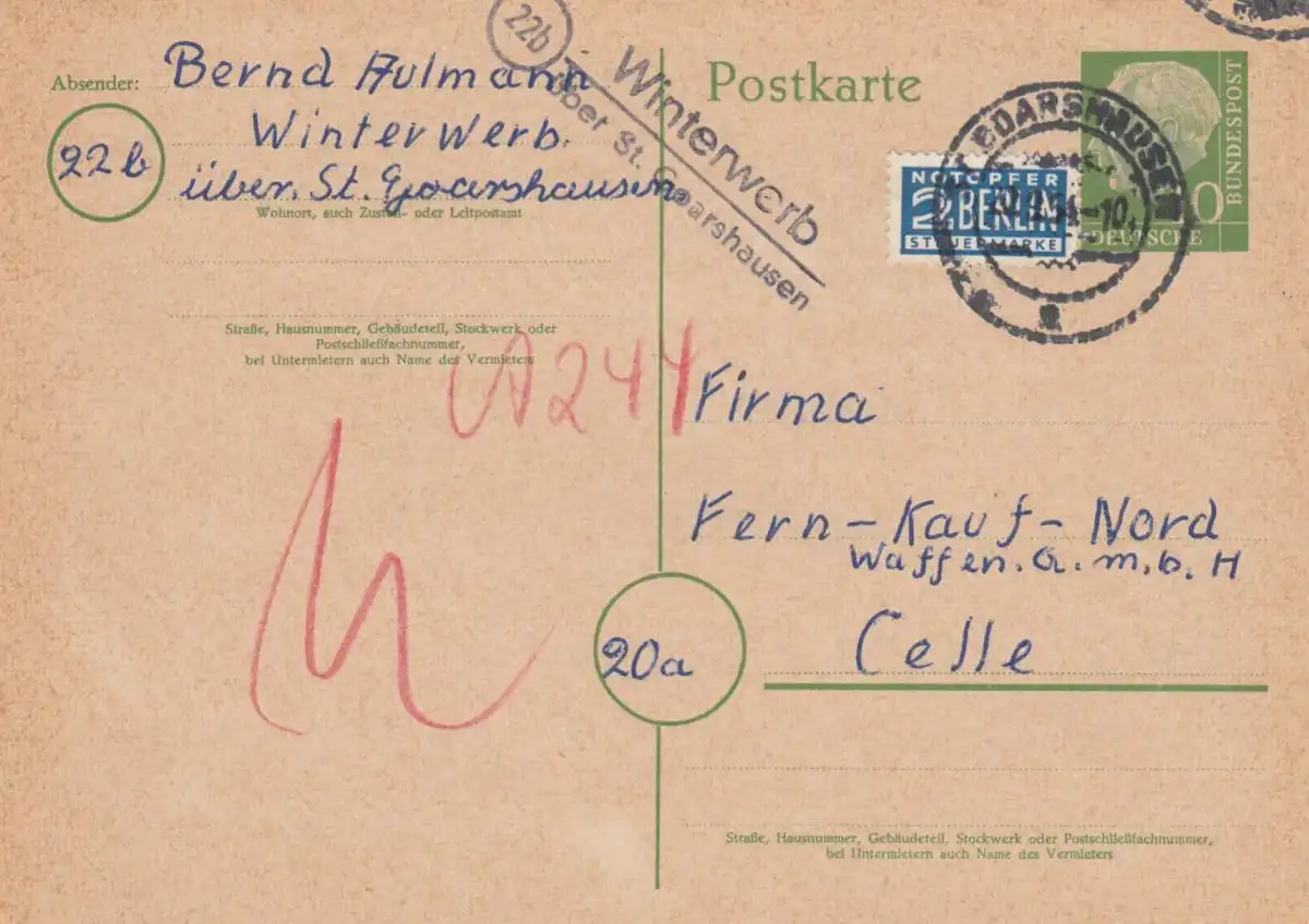 Ganzsache 1954 von Winterwerb über St. Goarshausen nach Celle