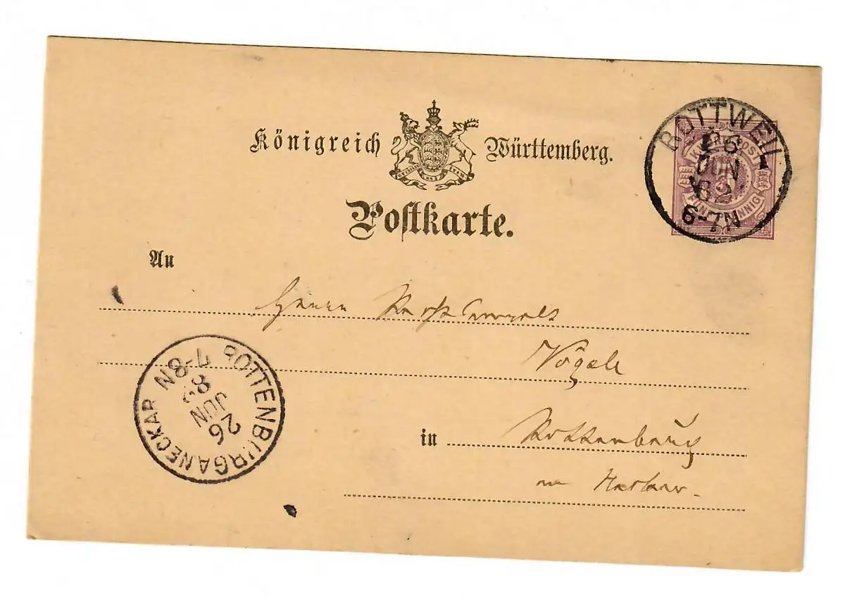 Ganzsache Rottweil 1882 nach Rottenburg/N