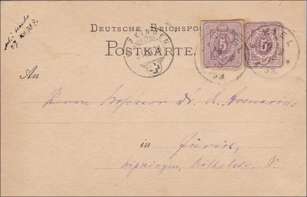 Ganzsache von Kiel in die Schweiz 1878