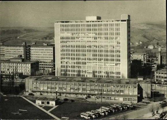 Ganzsachen Ak Zlín Gottwaldov in Mähren Region Zlin, Hochhaus, Autobusse