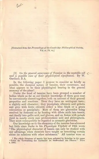 Titel: On the general occurrence of Tannins in the vegetable cell and a possible view of their physiological significance. Extracted from the Proceedings of the Cambridge Philosophical Society Vol. IV, Pt. Vi