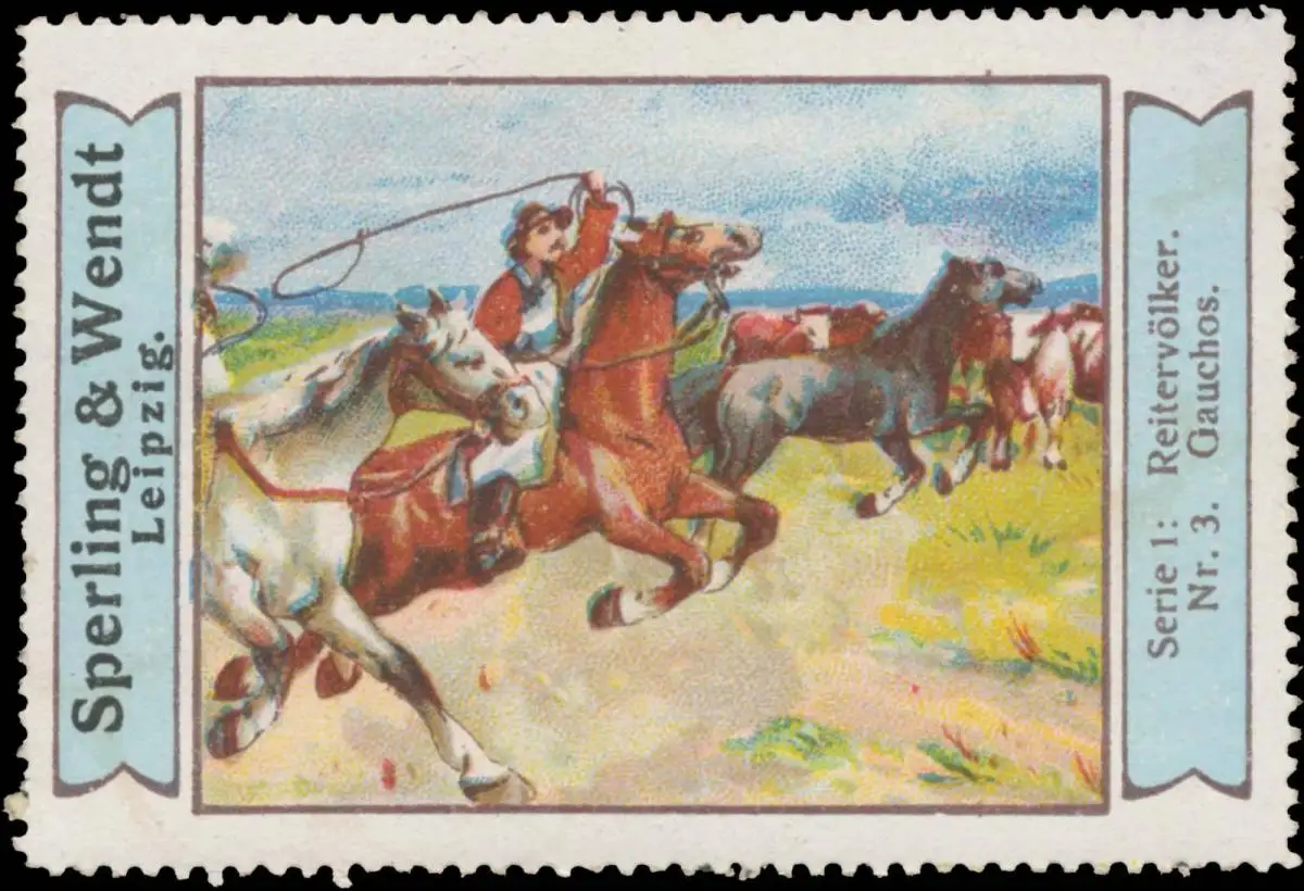 Serie Reitervölker Nr. 3, Sperling & Wendt Kleiderstoffe und Damengarderobe, Petersstraße 37, Pferde, Größe/Zustand: 5x7 , guter Zustand, Original alte Reklamemarke die seinerzeit für die Werbung benutzt wurde
