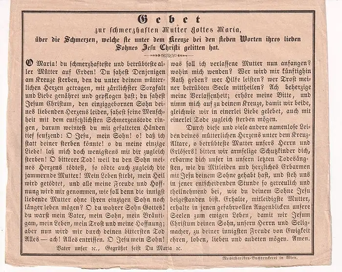 Bemerkungen: Gebet zur schmerzhaften Mutter Gottes Maria, über die Schmerzen, welche sie unter dem Kreuze bei den sieben Worten ihres lieben Sohnes Jesu Christi gelitten hat aus der Mechitaristen-Druckerei in Wien. Der Orden der Mechitaristen wurde 1711 päpstlich bestätigt, 1805 kamen die Mechitaristen zunächst in das aufgelassen Wiener Kapuzinerkloster "Am Platzl", 1837 wurde das Kloster neu gebaut. Bereits 1811 wurde eine eigene Druckerei gegründet, in der Bücher in über 50 orientalischen Sprachen gedruckt wurden.