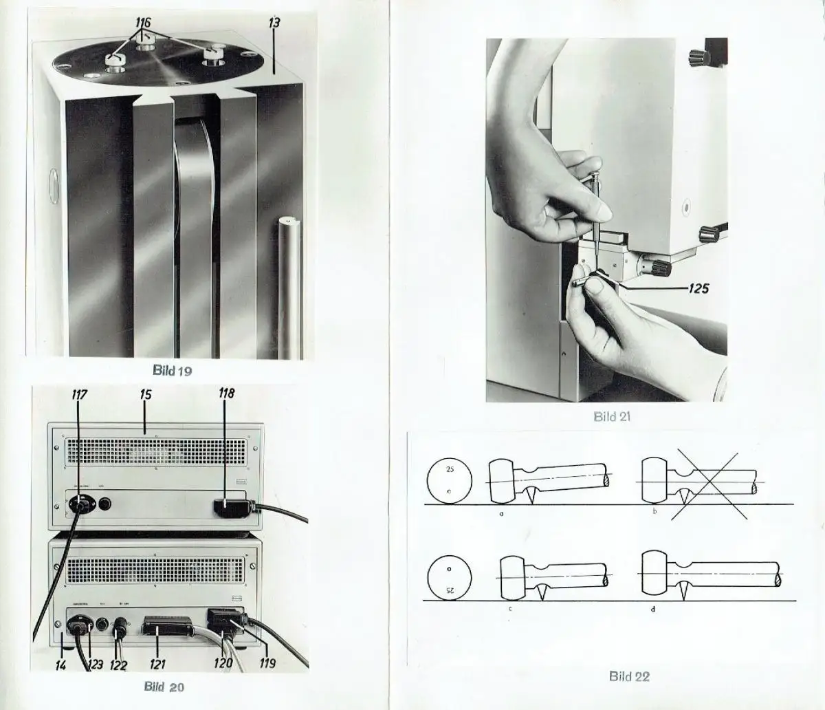 sehr guter Zustand, geringe Gebrauchs- und Alterungsspuren: Deckel und Titel mit durchgestrichener Notiz - 10 Blatt mit kleinem Dreiangel im senkrechten Rand - Umschlag an den Ecken leicht angeknickt, Das Tastschnittgerät ME 10 gestattet die Prüfung der Gestalt technischer Oberflächen. Durch Abtasten des Prüflings mit einem Tastorgan kann seine Oberflächenstruktur erfaßt und analysiert werden, Das Gerät enthält eine exakte Geradführung, so daß neben der Prüfung der Gestaltabweichungen 3. bis 5. Ordnung (Rauheit) auch die Ermittlung der Fehler 2. Ordnung (Welligkeit) und 1. Ordnung (Formfehler, sofern sie Abweichungen von einer Geraden bis max. 100 mm Länge darstellen) möglich ist. Im Gegensatz zu optischen Meßverfahren, bei denen nur ein kleiner Ausschnitt der Oberfläche des Prüflings beobachtet werden kann, erhält man beim Arbeiten mit dem Tastschnittgerät einen Profilschrieb in einer senkrecht zur Oberfläche liegenden Ebene (Tastschnitt, Bild 1). Mit dem Tastschnittgerät ME 10 lassen sich die wichtigsten Maße der Gestaltabweichungen (nach TGL 0-4760 bis 0-4763 ) bestimmen und am Anzeigeinstrument des Rechners ablesen. Das Gerät wird dort eingesetzt, wo die Rauheit oder Geradheit von Funktionsflächen geprüft werden müssen. Das ist: Zur Prüfung der Arbeitsgenauigkeit von Werkzeugmaschinen (Untersuchung der auf der Maschine hergestellten Werkstücke auf Einhaltung der vorgeschriebenen Form).Zur Fertigungskontrolle geschliffener, geläppter oder geschabter Flächen (z.B. Führungen) .Zur Prüfung der Geradheit von Wellen, Zylindern oder Bohrungen (z.B. Einspritzpumpen, hydraulisch arbeitenden Apparaturen, Verbrennungsmaschinen), Halbleinen, ca. 20,5 x 29, 65 Seiten Text und 31 Fotos, montiert auf Ausschlagtafeln