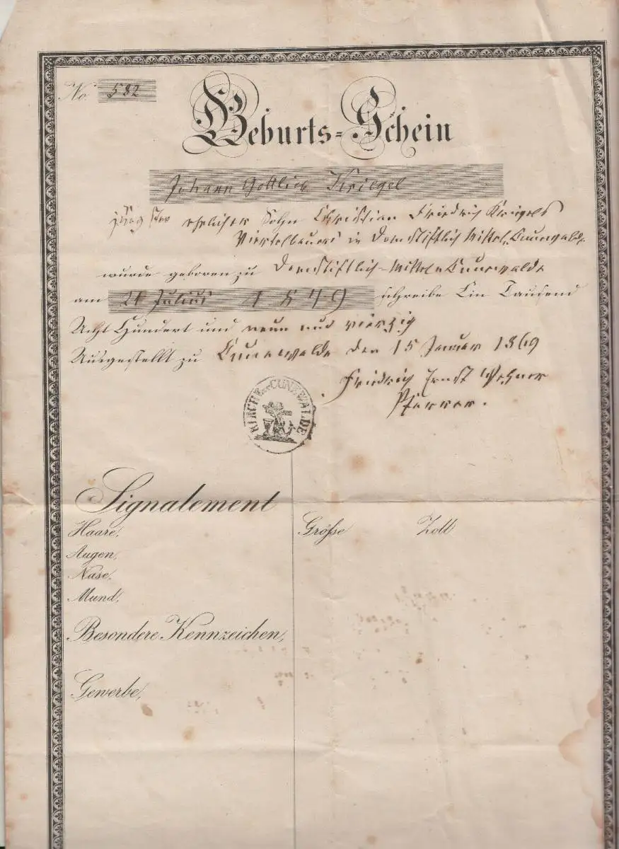 Originaler, einseitiger Geburtsschein, Format: 23 cm x 35 cm