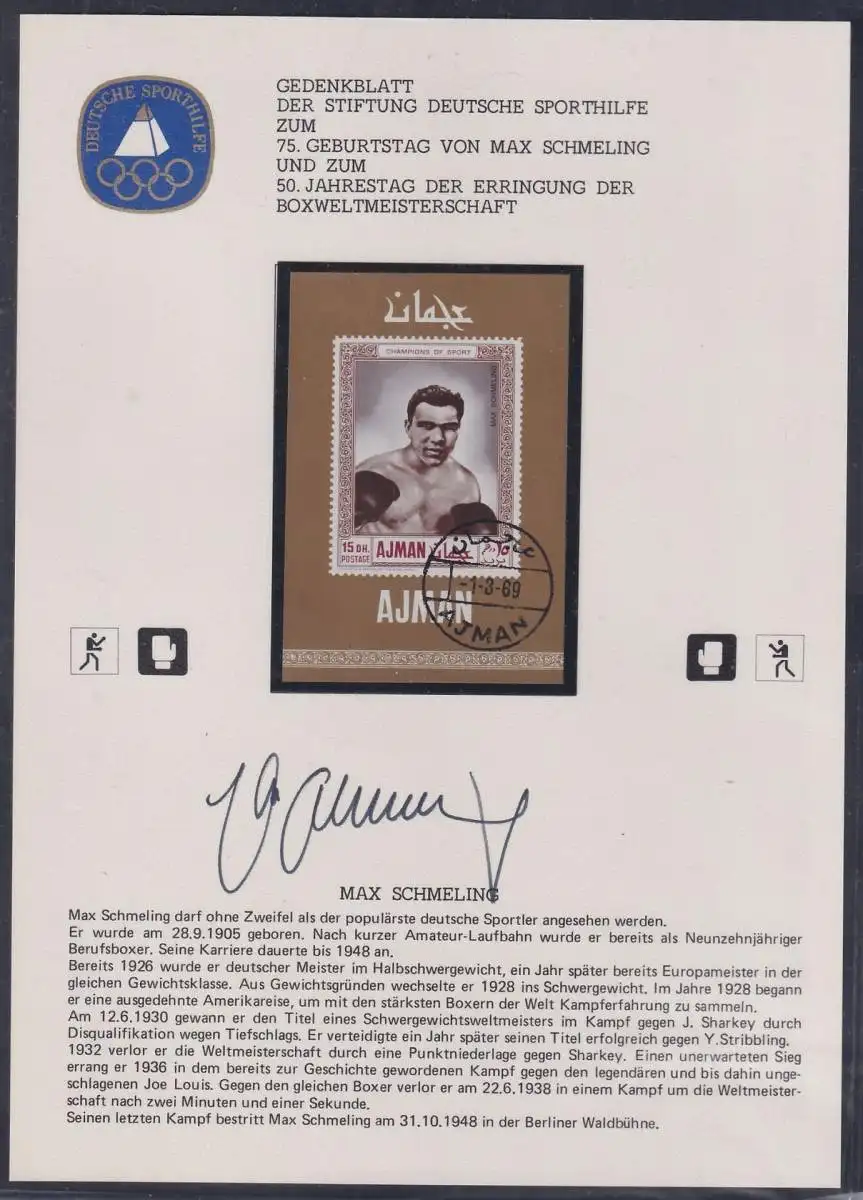 Gedenkblatt "Max Schmeling" mit Original Autogramm #NS060