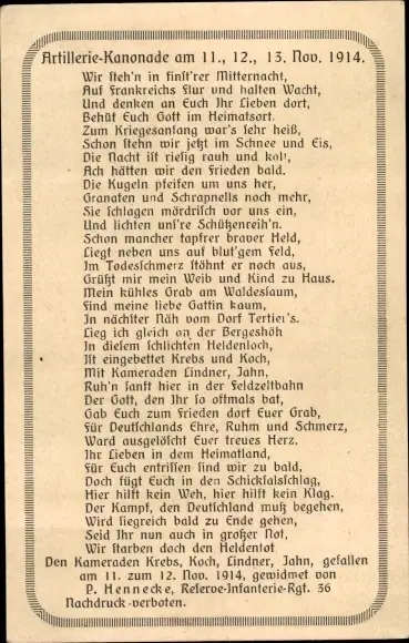 Gedicht Ak Artillerie Kanonade am 11. November 1914, Wir steh'n in finstrer Mitternacht, I WK