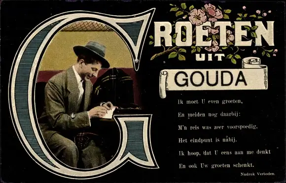 Gedicht Ak Gouda Südholland Niederlande, Grüße aus, Mann schreibt einen Brief