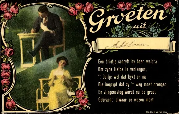 Gedicht Passepartout Ak Grüße aus, Mann schreibt einen Brief, Frau liest ihn