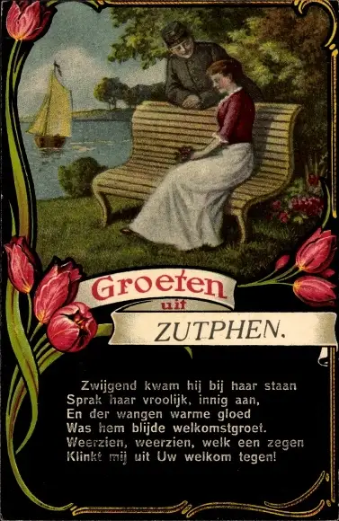 Gedicht Passepartout Ak Zutphen Gelderland, Grüße aus, Liebespaar, Soldat