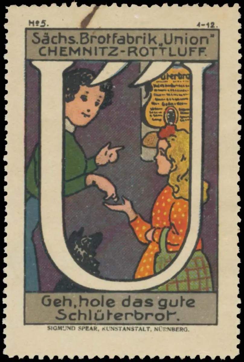 Bäckerei Schlüterbrot Buchstabenserie, Nr. 5, Kind, Hund, Druck: Kunstanstalt Sigmund Spear, Nürnberg, Größe/Zustand: 6x4 , Fehldruck, guter Zustand, Original alte Reklamemarke die seinerzeit für die Werbung benutzt wurde