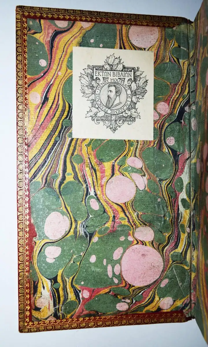 seine marmorierten Vorsätze „à la Derôme“ mit rosa und grünen