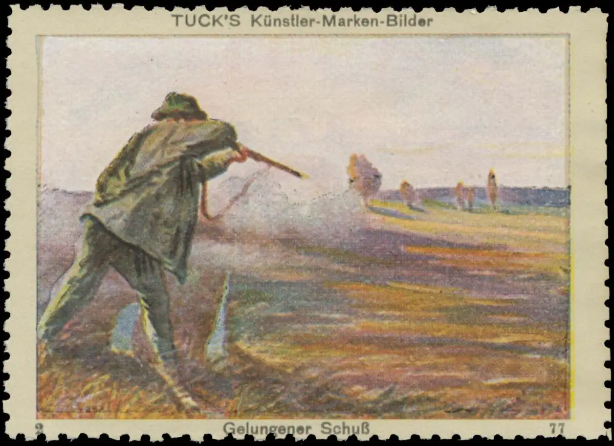 Jagd, Serie 77, Bild 2, Tucks Künstler-Marken-Bilder, Propaganda-Marke, Auflage 3000 Stück, Größe/Zustand: 4x7 , guter Zustand, Original alte Reklamemarke die seinerzeit für die Werbung benutzt wurde