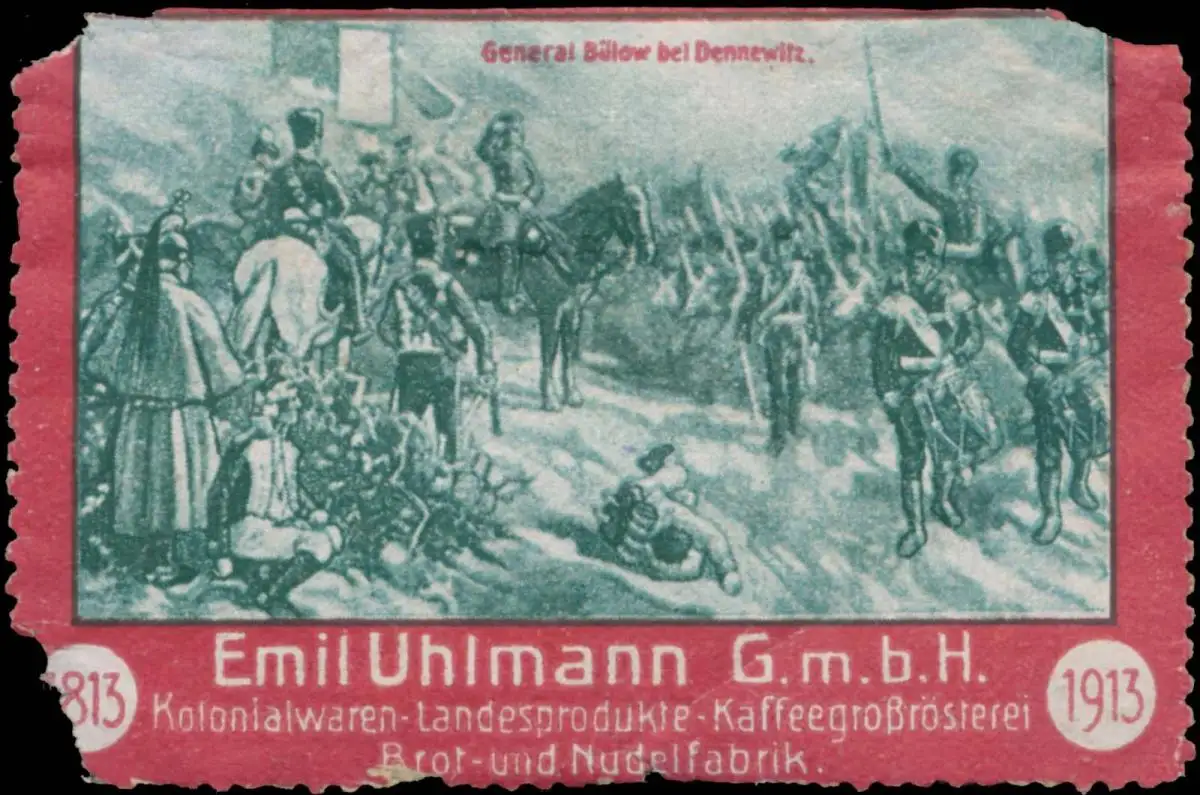 Befreiungskriege, Kolonialwaren, Landesprodukte, Kaffeegroßrösterei, Brot- und Nudelfabrik, Größe/Zustand: 4x7 , beschädigt, Original alte Reklamemarke die seinerzeit für die Werbung benutzt wurde