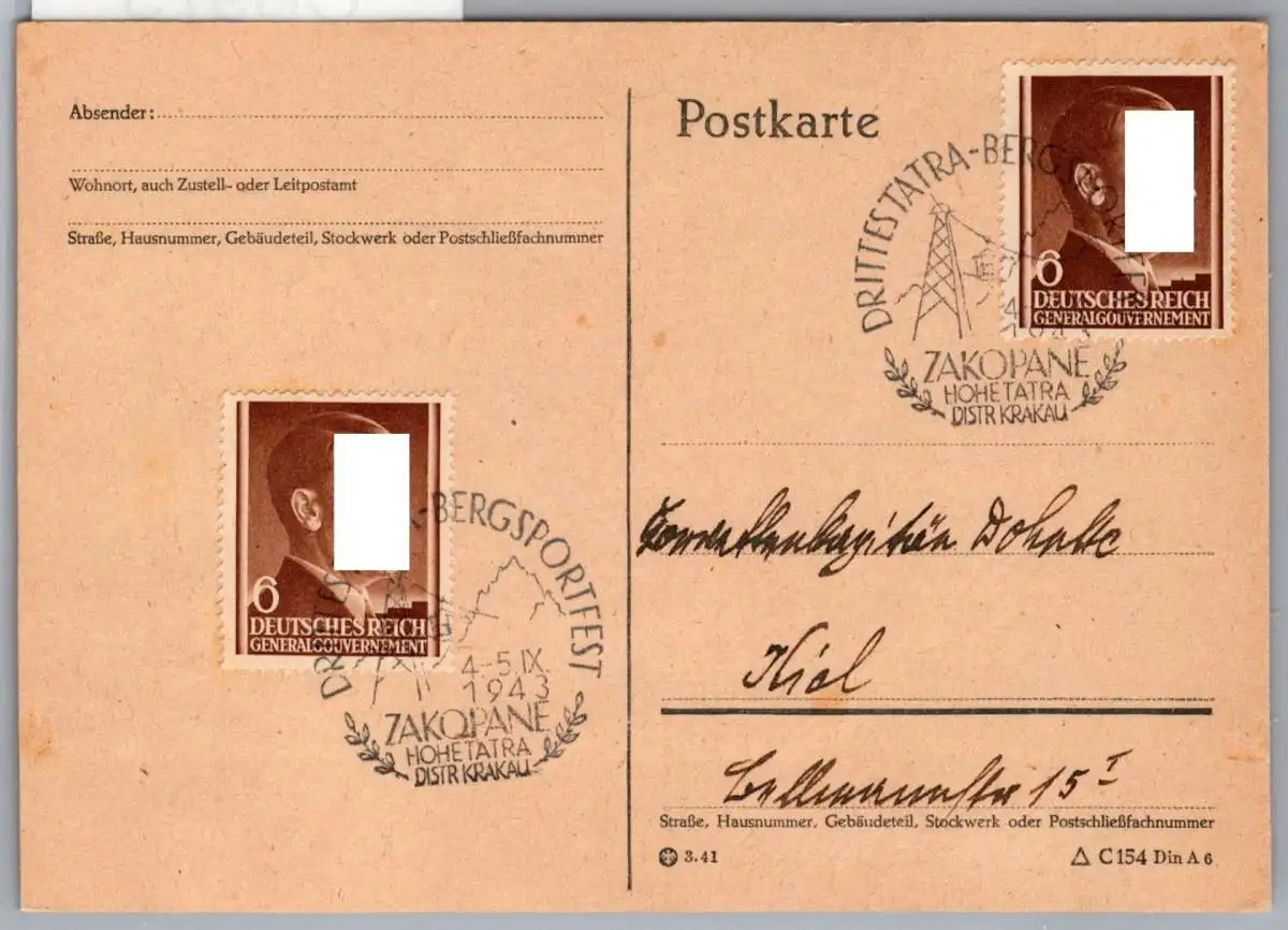 6 Groschen Freimarke mit Sonderstempel Zakopane 4.-5.9.1943.
