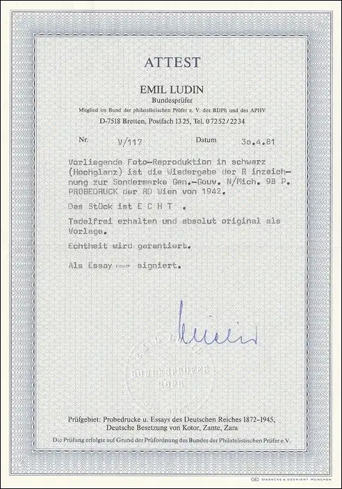 Generalgouvernement (GG), Foto Essay der Marke MiNr. 98 als Grundlage für die Arbeit der Stecher. Mit BPP Attest.