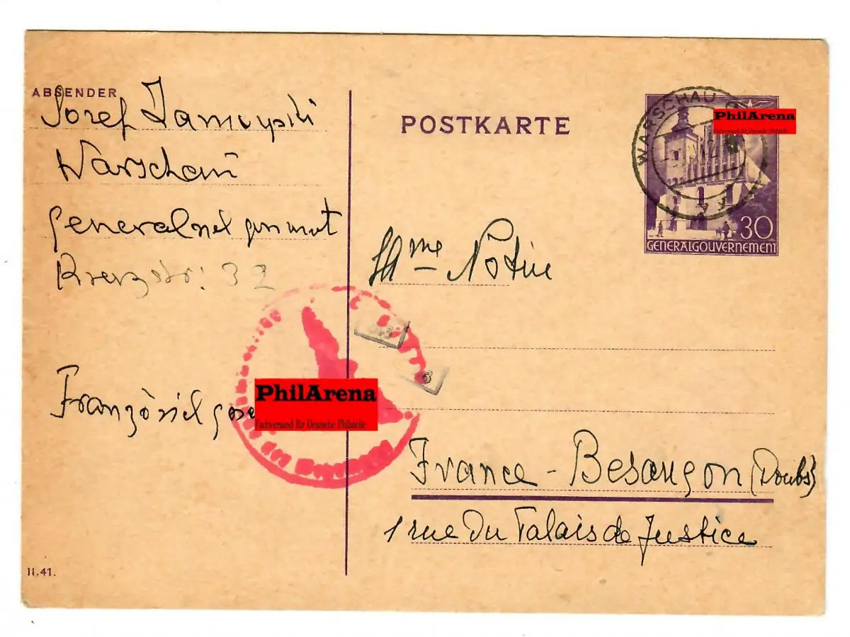 Generalgouvernement GG: Ganzsache P11: Warschau - Frankreich - Zensur