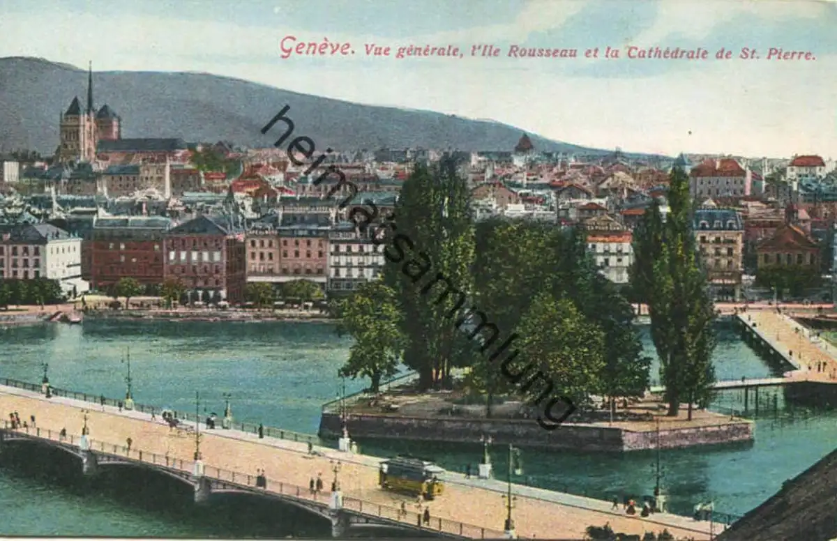 Genève - Vue generale - L' Ile Rousseau et la Cathedrale de St. Pierre