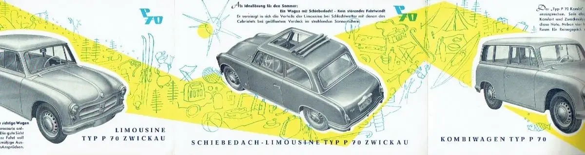 sehr guter Zustand, geringe Gebrauchs- und Alterungsspuren, kleiner Prospekt für den P 70, das Vorgängermodell des Trabant Limousine, Schiebedach-Limousine und Kombiwagen werden in Bild und technischen Daten vorgestellt, Papier, ca. 18,5 x 11,5, 6 Seiten mit 3 Fotos und einigen Illustrationen