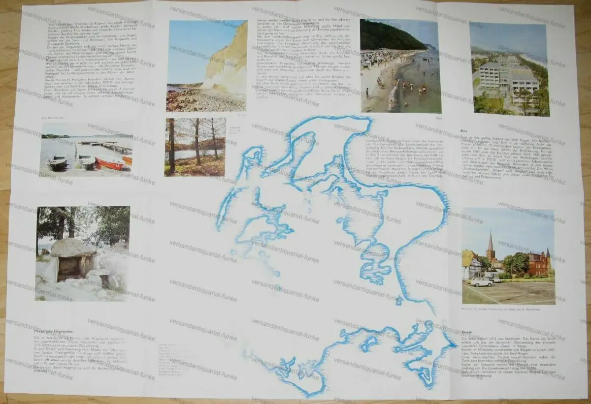 guter bis sehr guter Zustand, geringe Gebrauchs- und Alterungsspuren: etwas ungleichmäßig gefalten - Hauptfalz teils etwas knittrig, die Insel stellt sich vor - Allgemein - Binz - Hünen- oder Hügelgräber - Bergen - Ernst-Moritz-Arndt-Turm - Jagdschloss Granitz - Arkona - Fischfang - Saßnitz-Hafen - Stubbenkammer - Verhaltensregeln, Papier, ca. 15 x 21 (aufgefaltet ca. 60 x 42), 16 Seiten mit 22 Bildern
