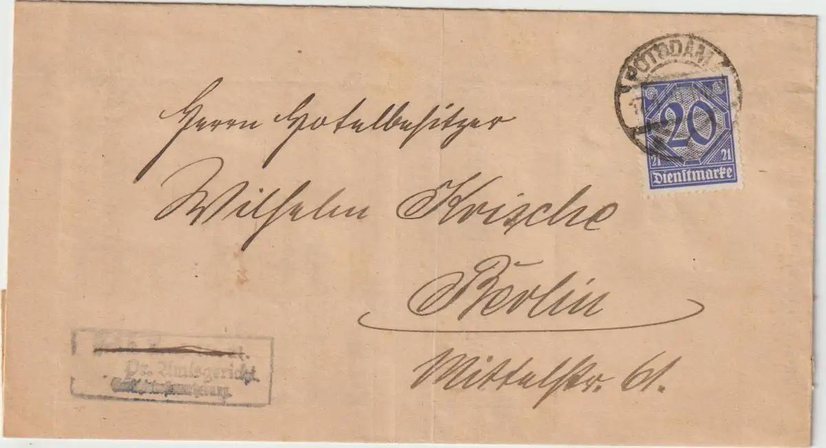Brief des Preuß. Amtsgerichts vom 17.4.20, portorichtigi mit EF. Mi.-Nr. D 19a, gute Bedarfserhaltung. Michelwert 75,00 €