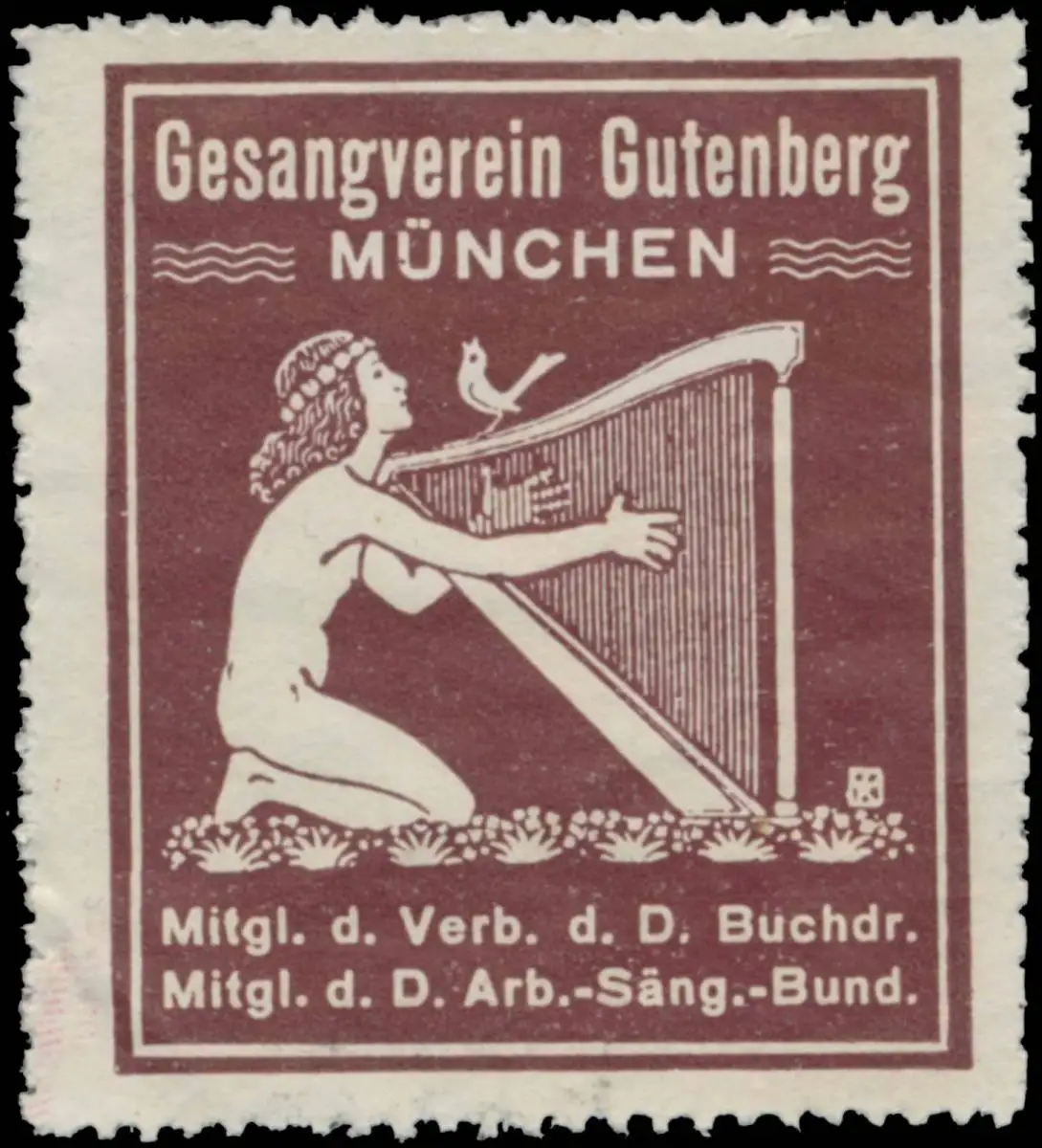 Mitglied d. Verb. D. Buchdr. und d.D. Arbeiter-Sänger-Bundes, Musik, Harfe, braun, Größe/Zustand: 5x4 , leicht geknickt, Original alte Reklamemarke die seinerzeit für die Werbung benutzt wurde