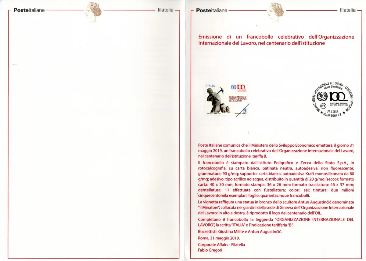 Illustratives Bulletin Gratisausgabe - OIL Illustratives Bulletin der Ausgabe Internationale Arbeitsorganisation OIL vom 31.5.19 - Auf dem Bulletin ist die Ausgabe und die Annullierung auf der Rückseite wiedergegeben KEIN PREIS, NUMMERIERUNG UND BARCODE FÜR DEN VERKAUF - GRATISAUSGABE - UNGEWÖHNLICH