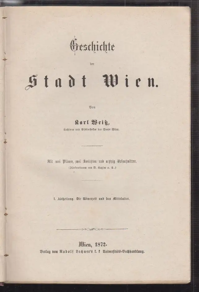Wien, Lechner 1872. 2 Abtheilungen in 1 Bd. Die Römerzeit und das Mittelalter/Die neue Zeit und die Gegenwart. 2 Bll., 278 (2) u. 417 (3) S. Mit zahlr., tlw. ganzseit.  Illustr. und 1 gefalt., farb. Plan. Ln. d. Zt. Mit goldgepr. Rückentit. Rückenkante geplatzt. Plan m. Einriß. EA.