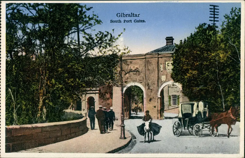 Gibraltar South Port Gates, Reiter auf Esel, Pferde-Kutsche 1910
