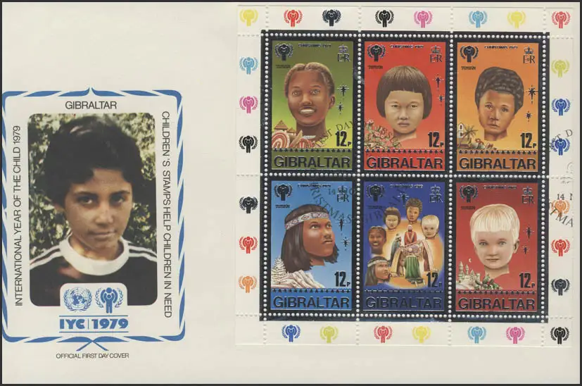 Gibraltar: Weihnachten & Kinderköpfe, Kleinbogen mit 6 Werten auf Schmuck-FDC