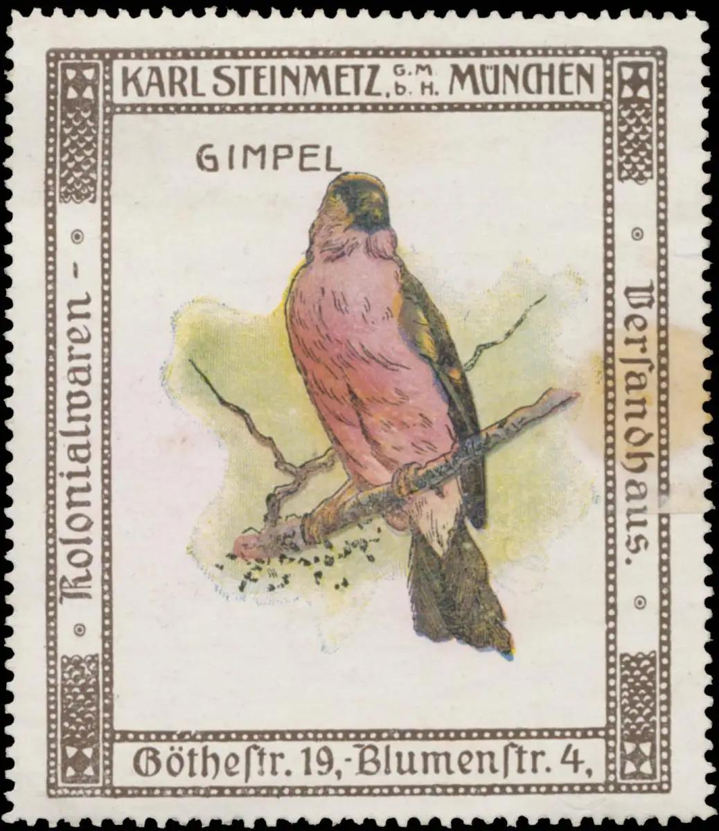 Vogel-Serie, Kolonialwarenversandhaus, Goethestraße 19, Blumenstraße 4, Größe/Zustand: 6x6 , guter Zustand, Original alte Reklamemarke die seinerzeit für die Werbung benutzt wurde